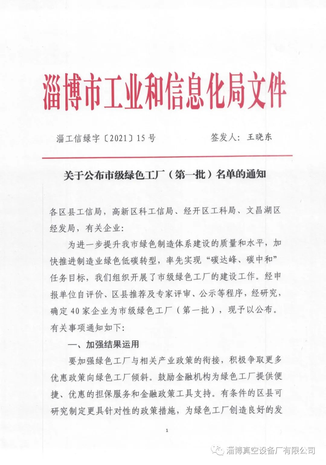 淄博真空設(shè)備廠有限公司獲得淄博市第一批“綠色工廠“榮譽(yù)稱號”